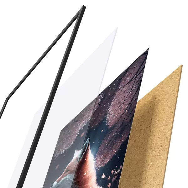 El póster consta de marco, plexiglás, imagen impresa y soporte de aglomerado. El póster puede colgarse inmediatamente en la pared gracias a los soportes de la parte posterior.