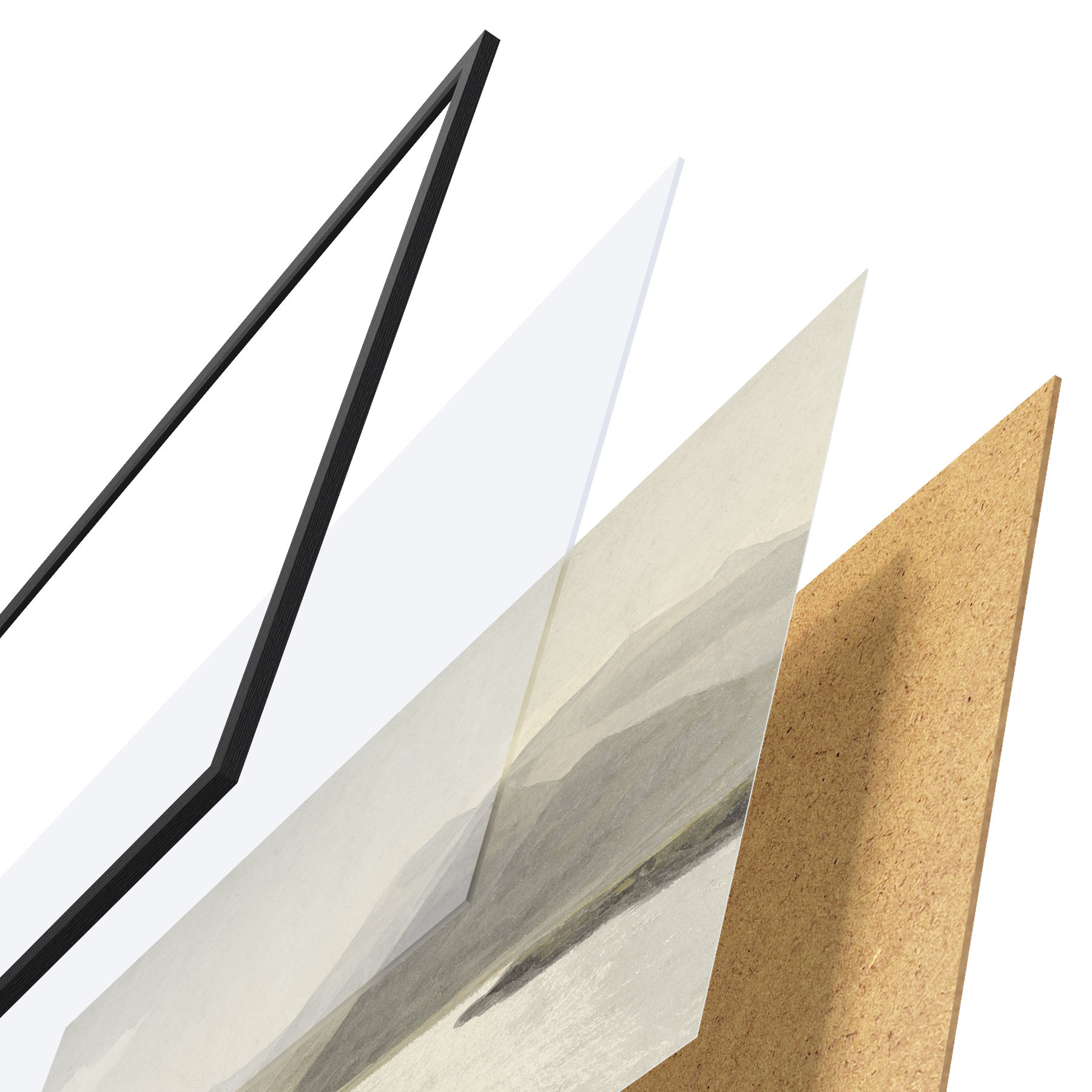 El póster consta de marco, plexiglás, imagen impresa y soporte de aglomerado. El póster puede colgarse inmediatamente en la pared gracias a los soportes de la parte posterior.