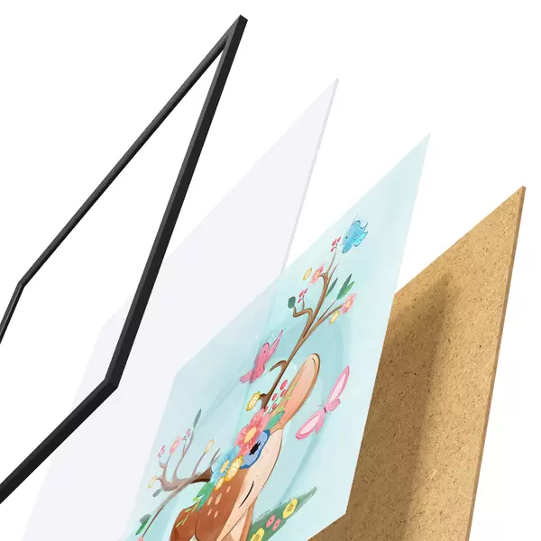 El póster consta de marco, plexiglás, imagen impresa y soporte de aglomerado. El póster puede colgarse inmediatamente en la pared gracias a los soportes de la parte posterior.