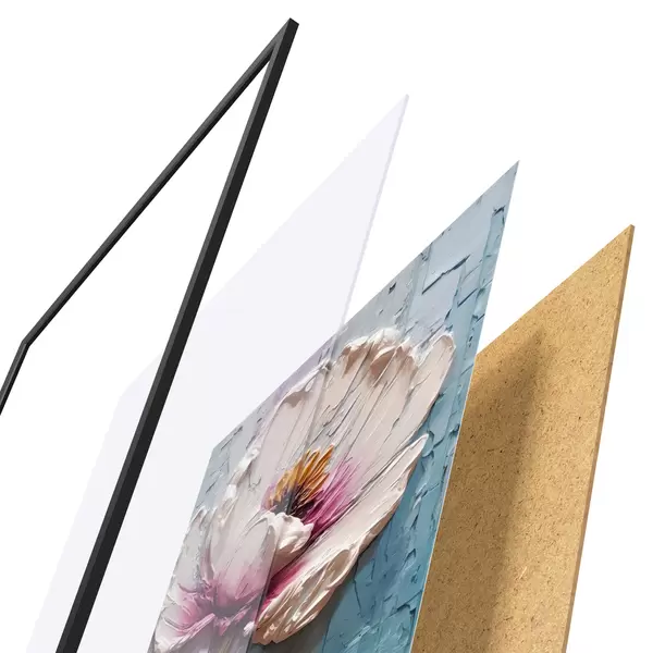 El póster consta de marco, plexiglás, imagen impresa y soporte de aglomerado. El póster puede colgarse inmediatamente en la pared gracias a los soportes de la parte posterior.