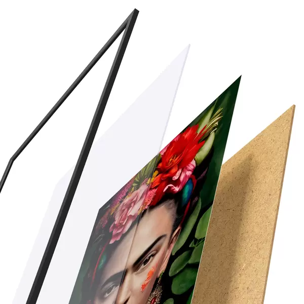 El póster consta de marco, plexiglás, imagen impresa y soporte de aglomerado. El póster puede colgarse inmediatamente en la pared gracias a los soportes de la parte posterior.