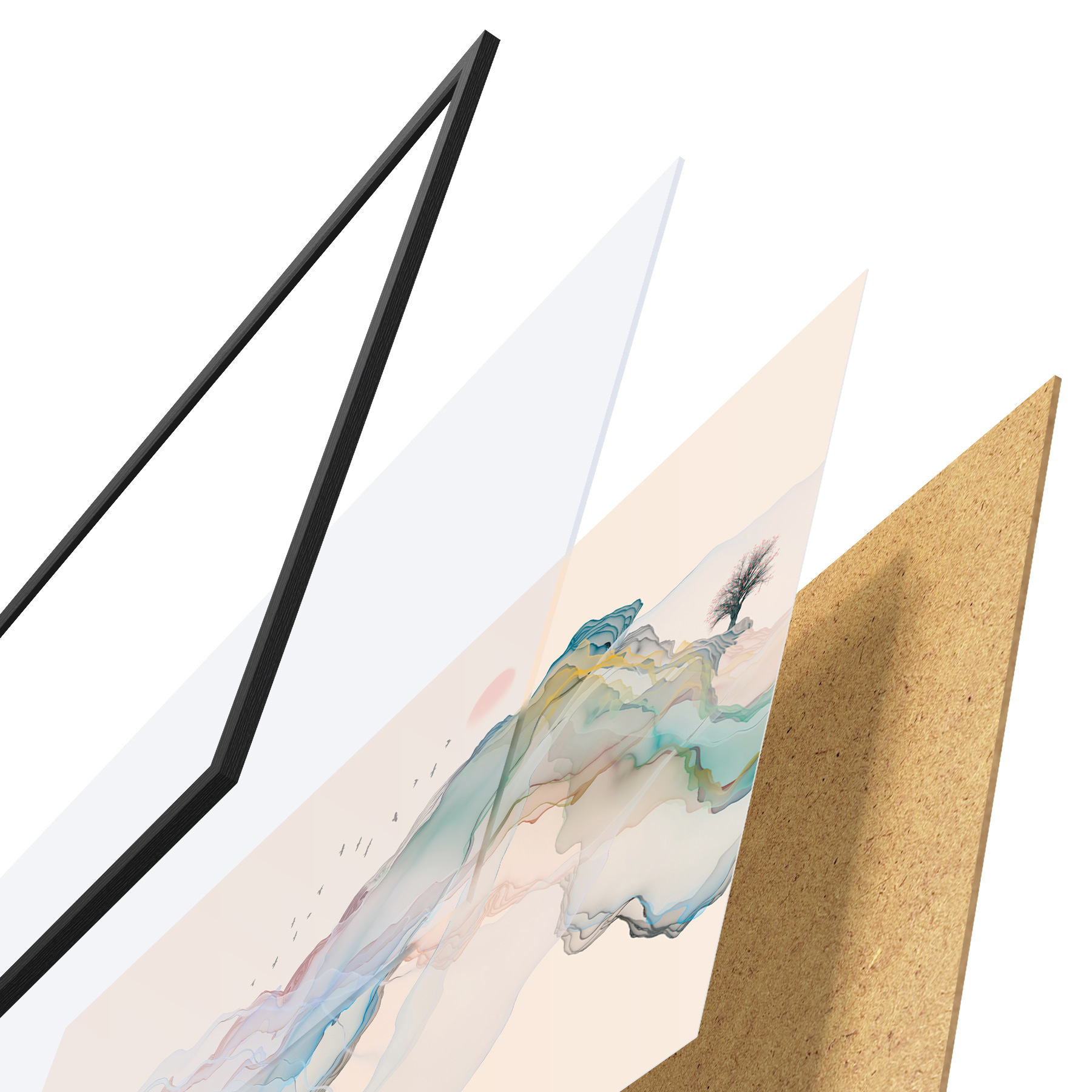 El póster consta de marco, plexiglás, imagen impresa y soporte de aglomerado. El póster puede colgarse inmediatamente en la pared gracias a los soportes de la parte posterior.
