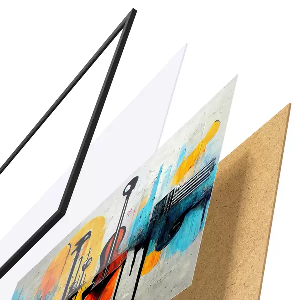 El póster consta de marco, plexiglás, imagen impresa y soporte de aglomerado. El póster puede colgarse inmediatamente en la pared gracias a los soportes de la parte posterior.