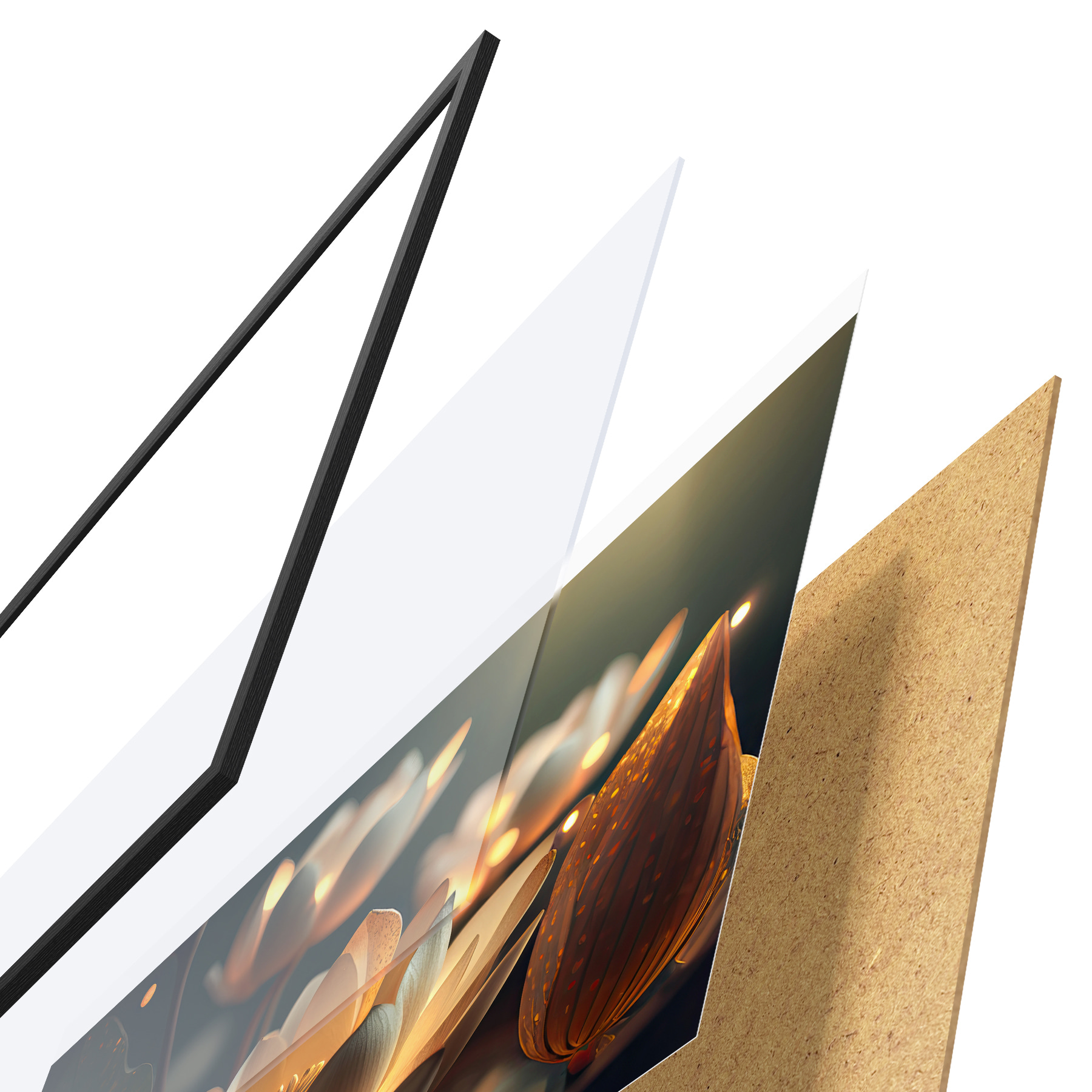 El póster consta de marco, plexiglás, imagen impresa y soporte de aglomerado. El póster puede colgarse inmediatamente en la pared gracias a los soportes de la parte posterior.