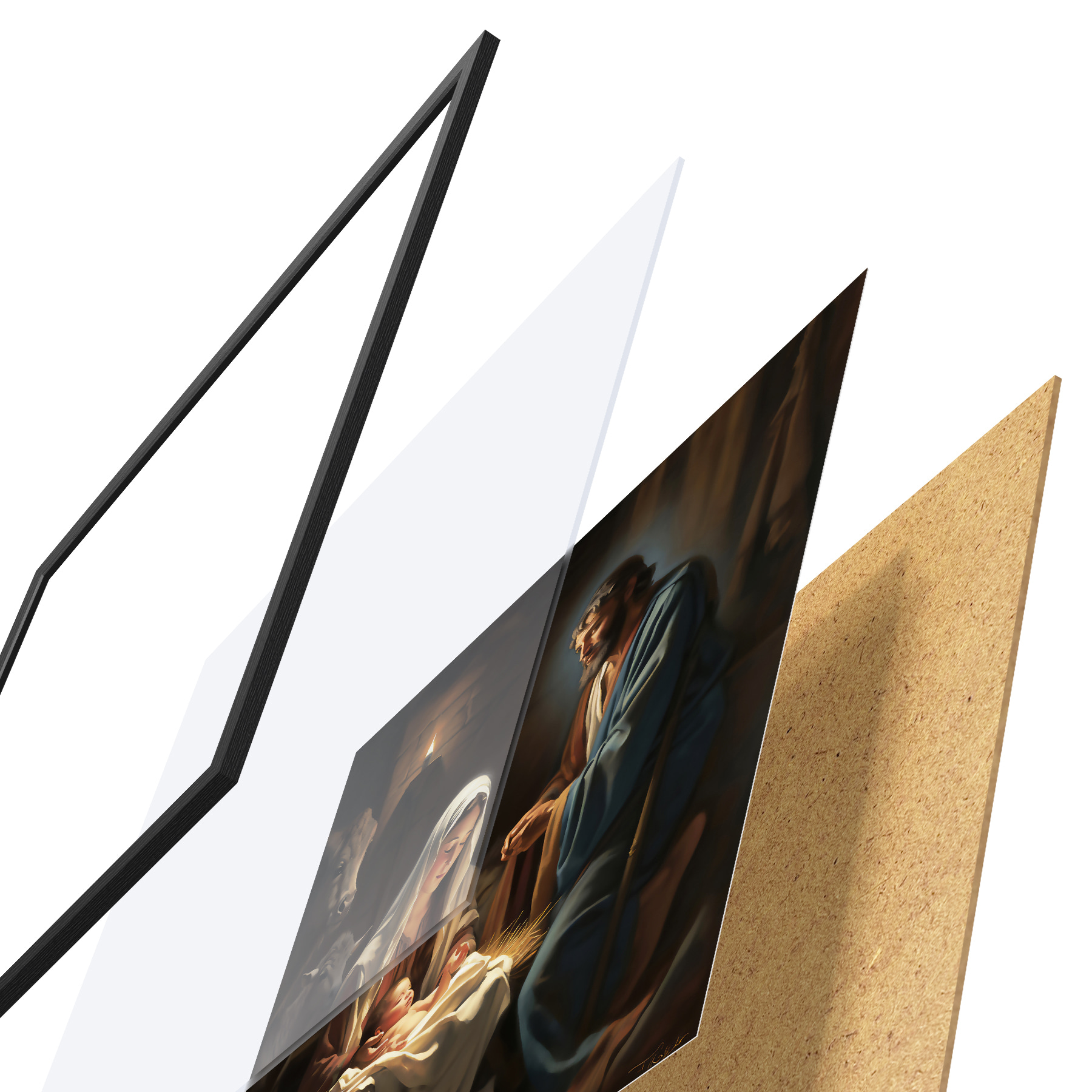 El póster consta de marco, plexiglás, imagen impresa y soporte de aglomerado. El póster puede colgarse inmediatamente en la pared gracias a los soportes de la parte posterior.