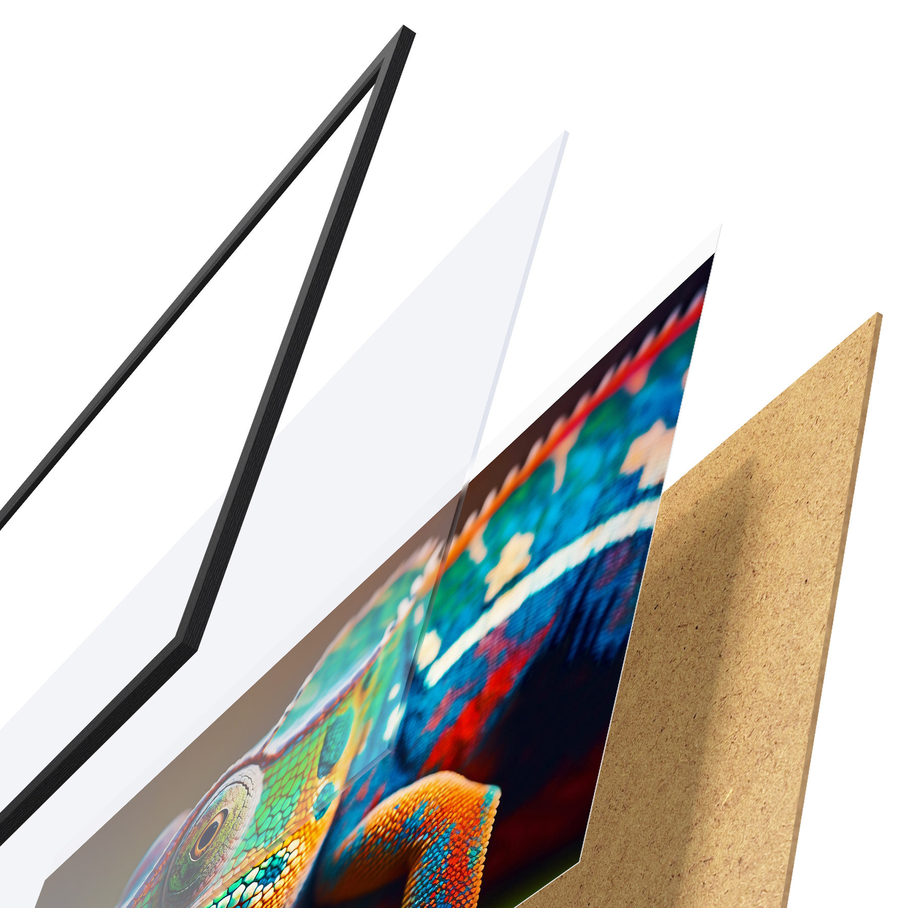 El póster consta de marco, plexiglás, imagen impresa y soporte de aglomerado. El póster puede colgarse inmediatamente en la pared gracias a los soportes de la parte posterior.