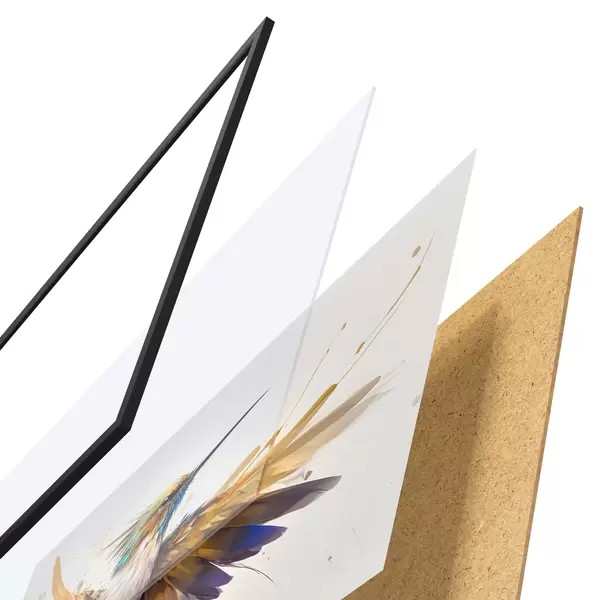 El póster consta de marco, plexiglás, imagen impresa y soporte de aglomerado. El póster puede colgarse inmediatamente en la pared gracias a los soportes de la parte posterior.