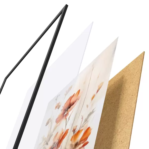 El póster consta de marco, plexiglás, imagen impresa y soporte de aglomerado. El póster puede colgarse inmediatamente en la pared gracias a los soportes de la parte posterior.