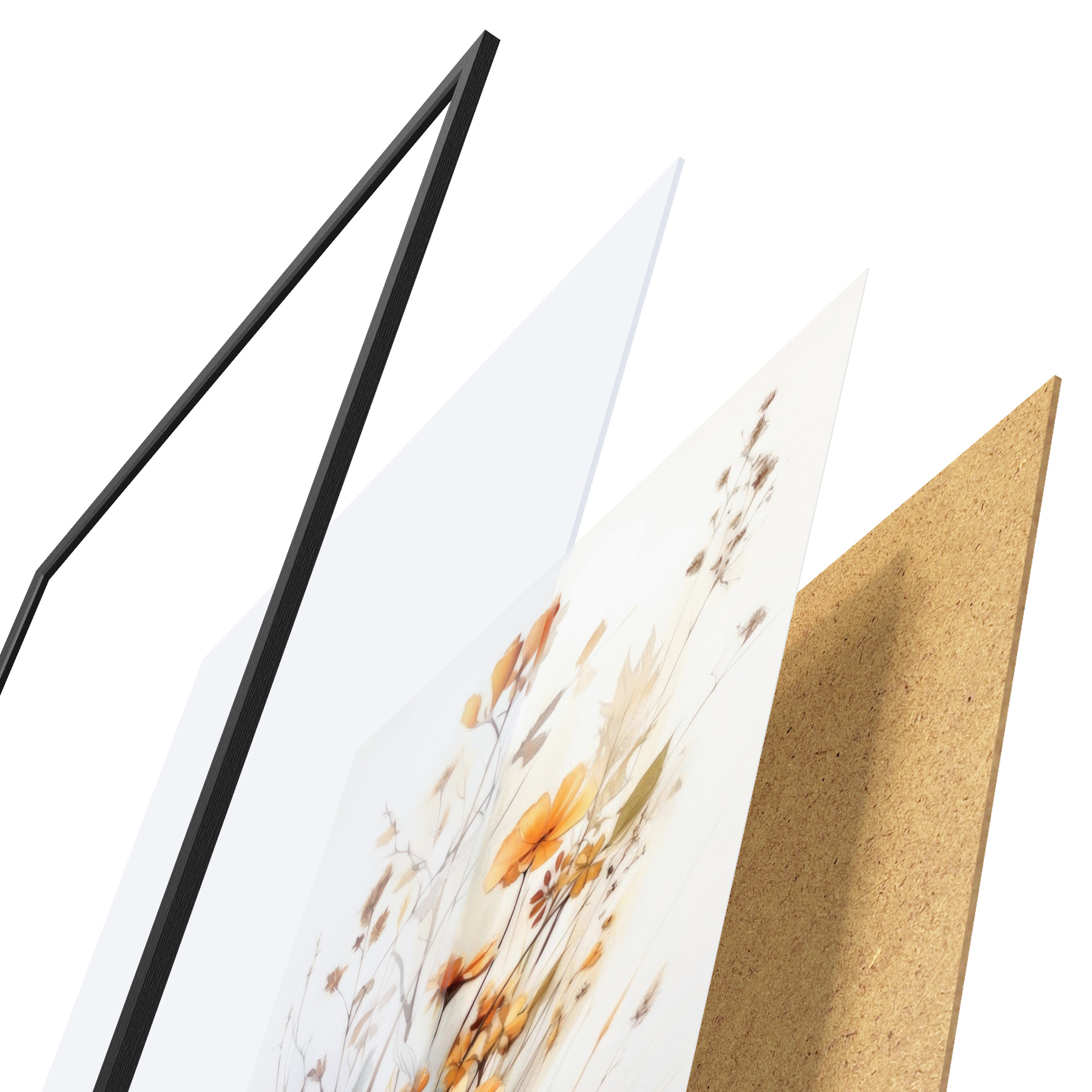 El póster consta de marco, plexiglás, imagen impresa y soporte de aglomerado. El póster puede colgarse inmediatamente en la pared gracias a los soportes de la parte posterior.