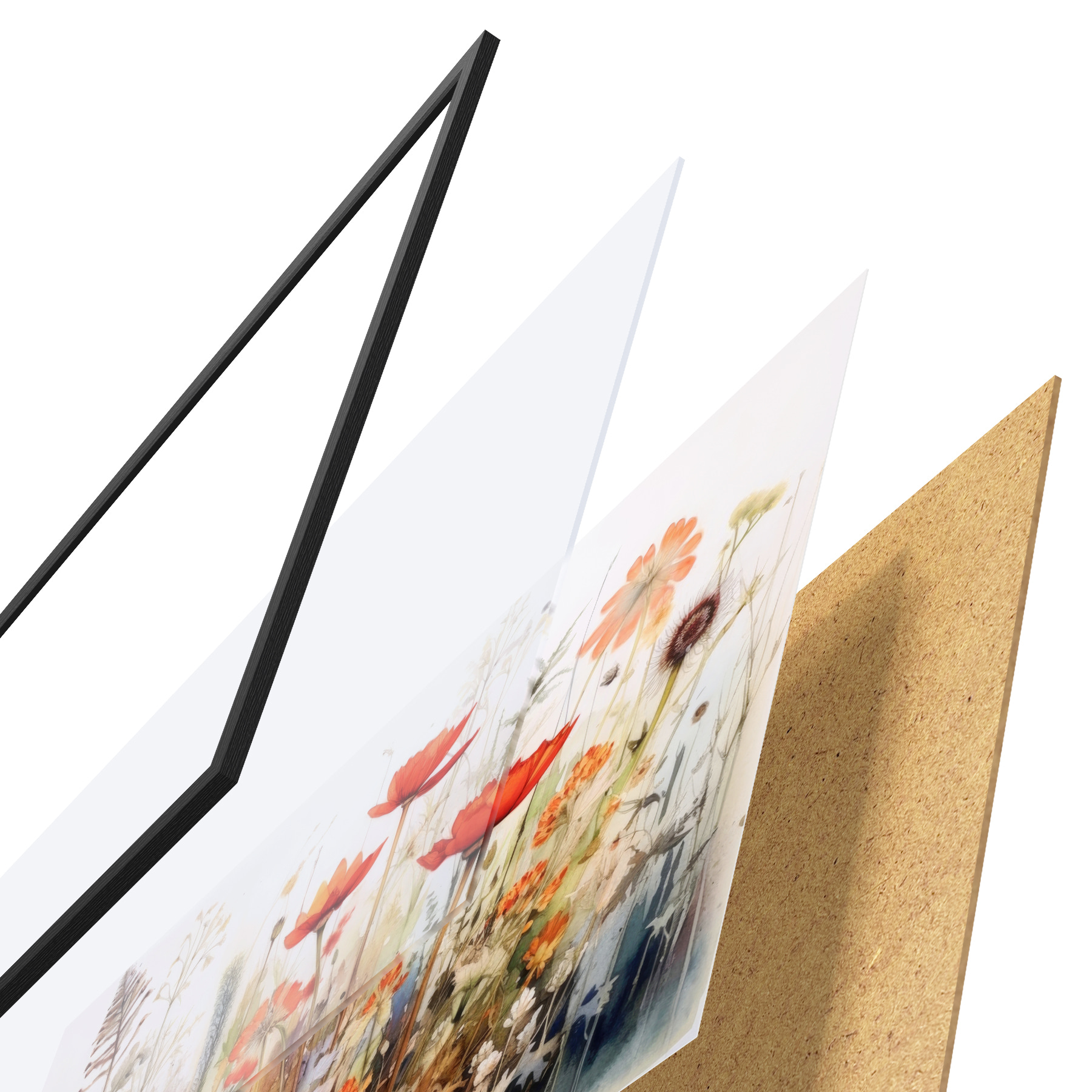 El póster consta de marco, plexiglás, imagen impresa y soporte de aglomerado. El póster puede colgarse inmediatamente en la pared gracias a los soportes de la parte posterior.