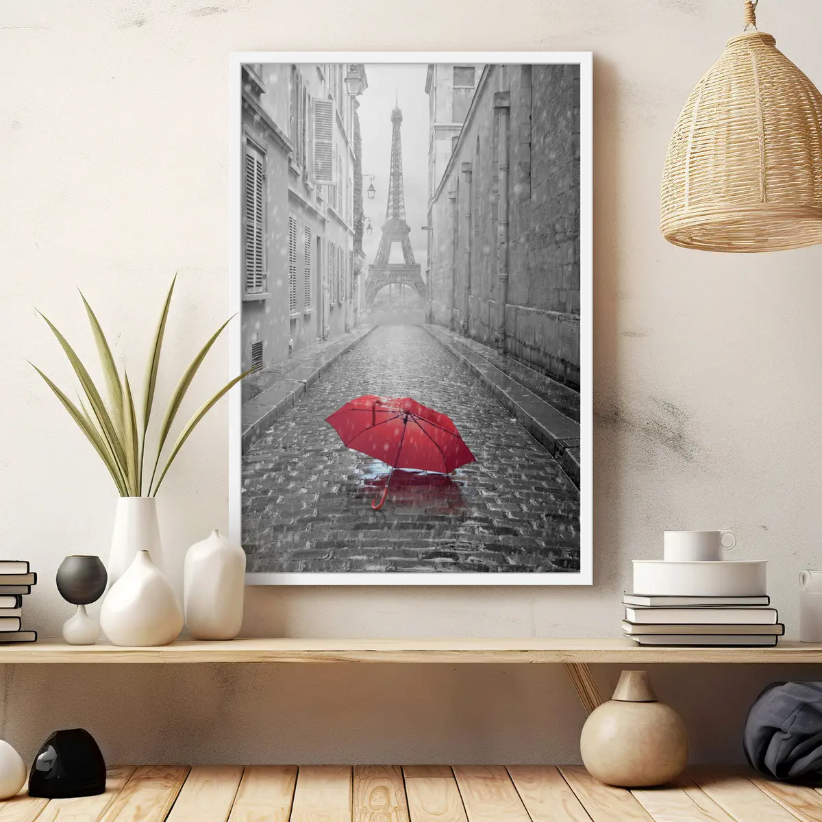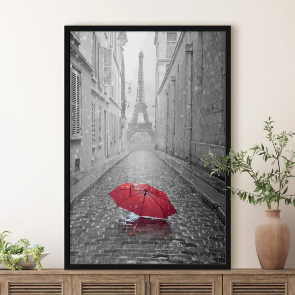 Poster Paraguas rojo en una calle adoquinada y mojada Nr f33713
