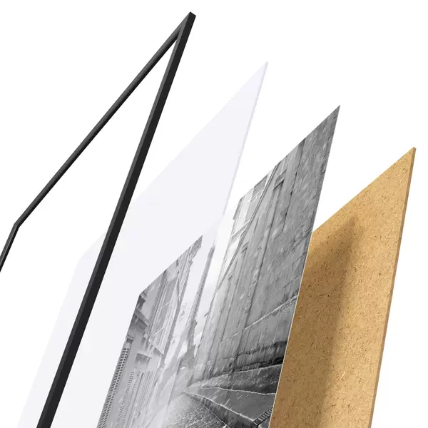 El póster consta de marco, plexiglás, imagen impresa y soporte de aglomerado. El póster puede colgarse inmediatamente en la pared gracias a los soportes de la parte posterior.