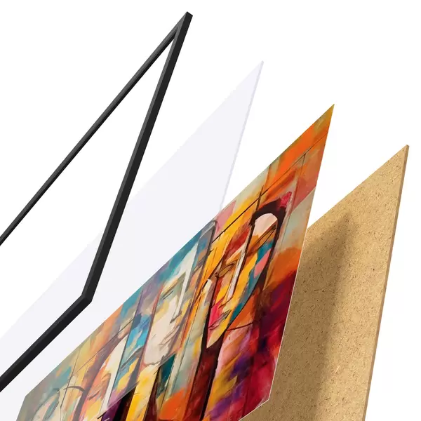 El póster consta de marco, plexiglás, imagen impresa y soporte de aglomerado. El póster puede colgarse inmediatamente en la pared gracias a los soportes de la parte posterior.