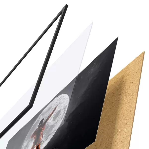 El póster consta de marco, plexiglás, imagen impresa y soporte de aglomerado. El póster puede colgarse inmediatamente en la pared gracias a los soportes de la parte posterior.