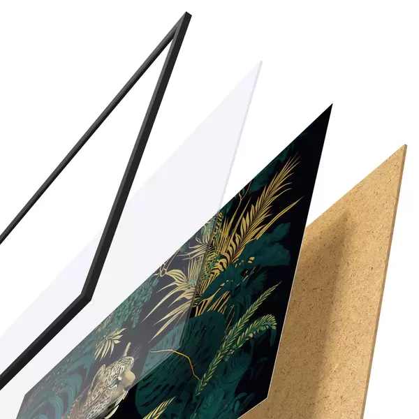 El póster consta de marco, plexiglás, imagen impresa y soporte de aglomerado. El póster puede colgarse inmediatamente en la pared gracias a los soportes de la parte posterior.