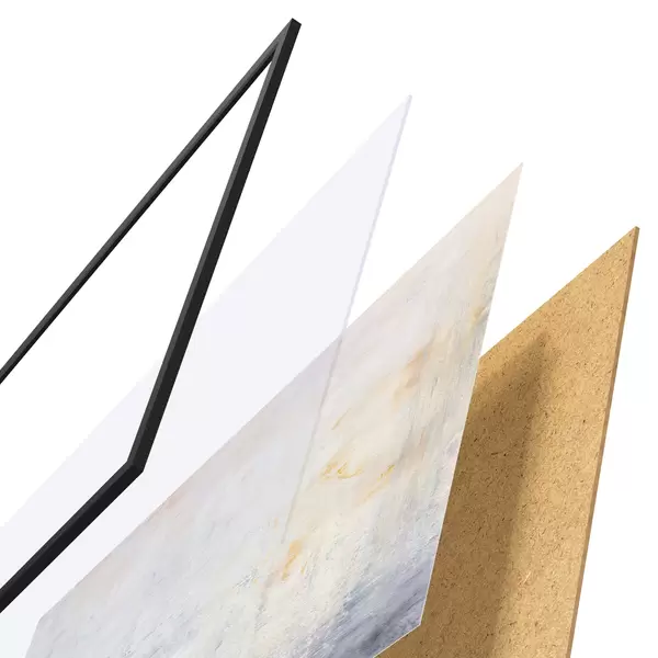 El póster consta de marco, plexiglás, imagen impresa y soporte de aglomerado. El póster puede colgarse inmediatamente en la pared gracias a los soportes de la parte posterior.