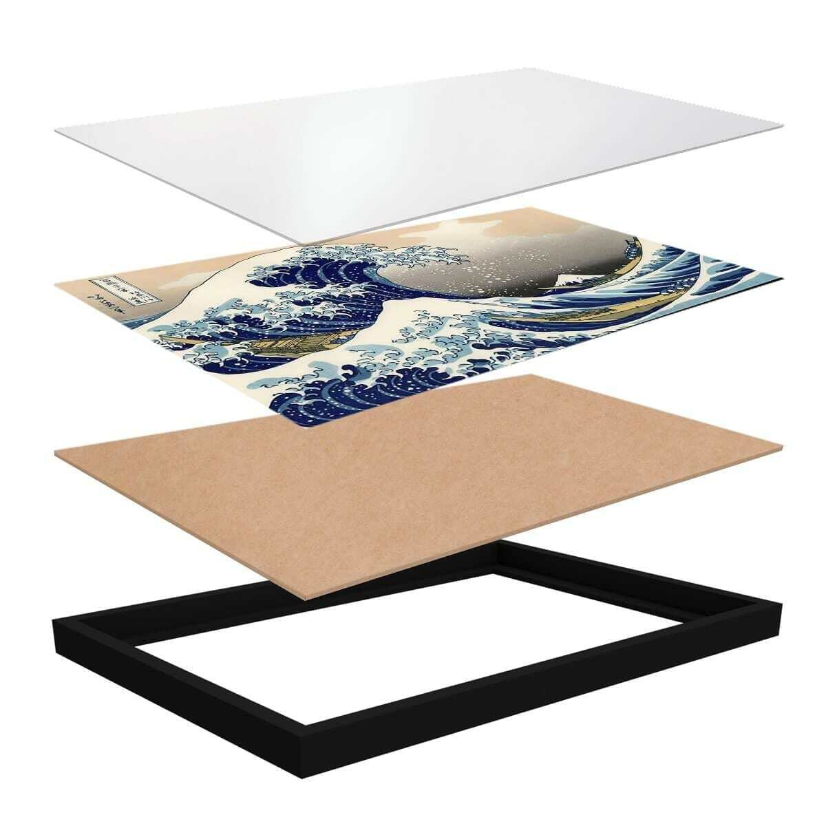 El póster consta de marco, plexiglás, imagen impresa y soporte de aglomerado. El póster puede colgarse inmediatamente en la pared gracias a los soportes de la parte posterior.