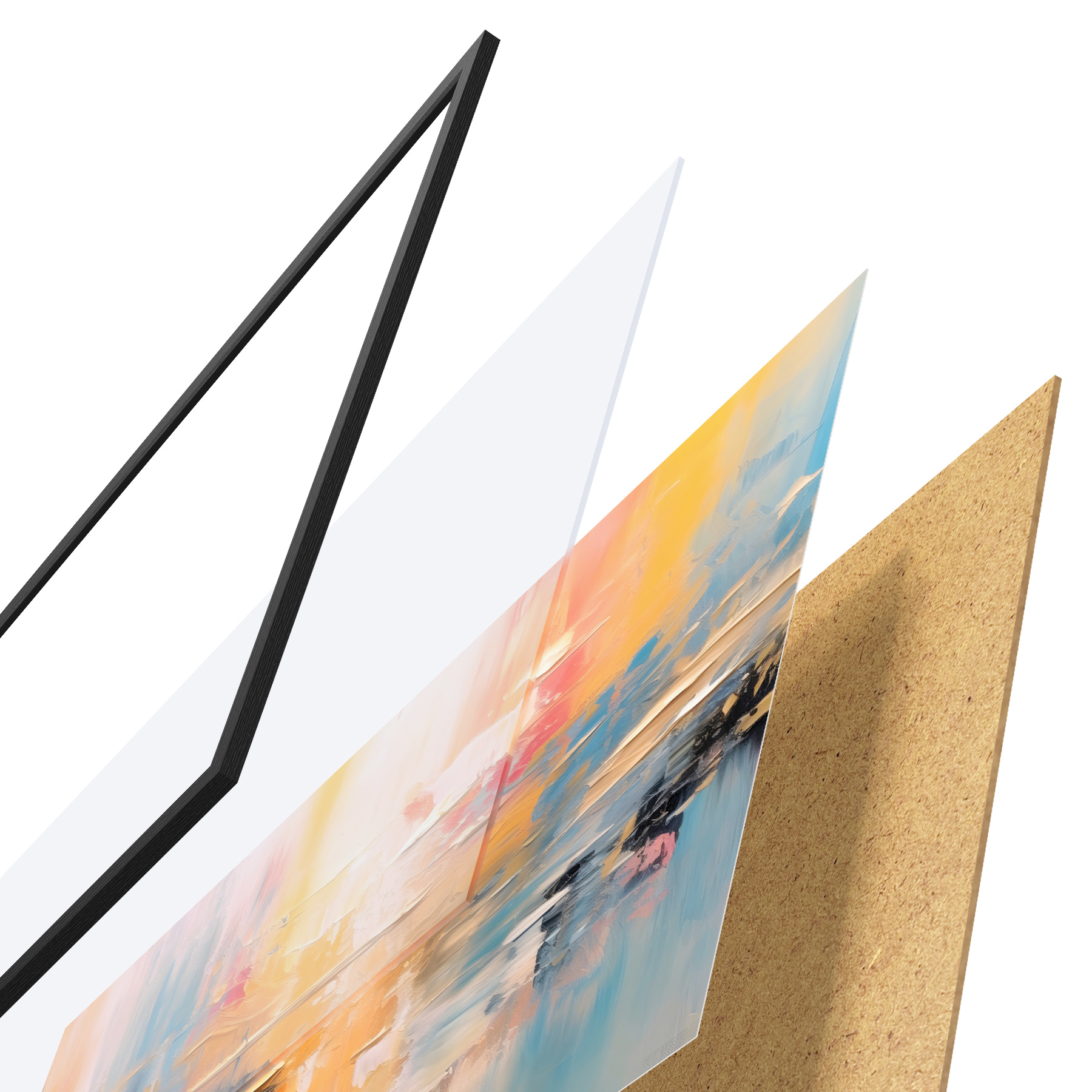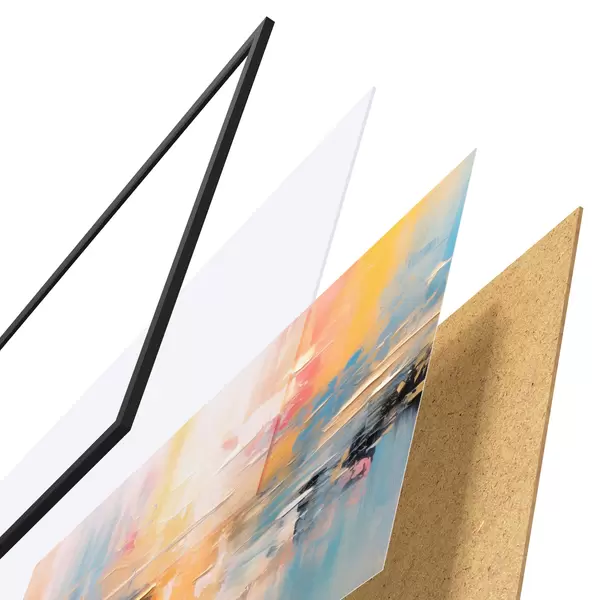 El póster consta de marco, plexiglás, imagen impresa y soporte de aglomerado. El póster puede colgarse inmediatamente en la pared gracias a los soportes de la parte posterior.