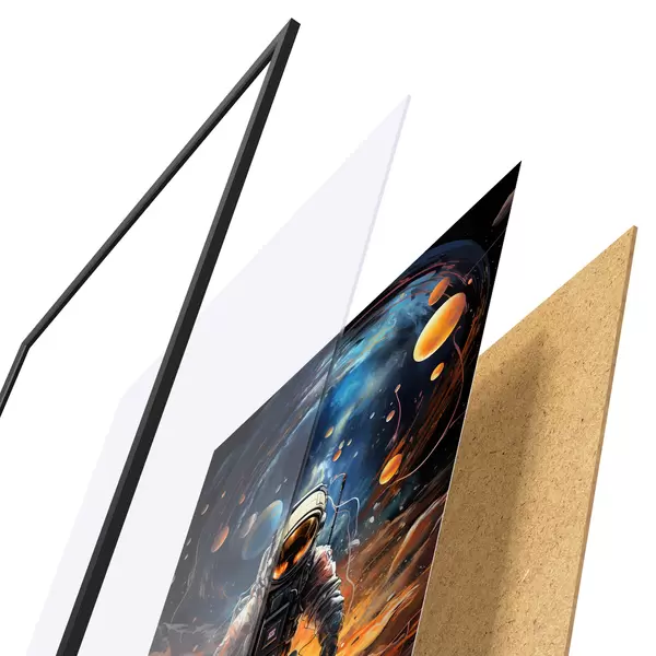 El póster consta de marco, plexiglás, imagen impresa y soporte de aglomerado. El póster puede colgarse inmediatamente en la pared gracias a los soportes de la parte posterior.