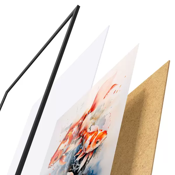 El póster consta de marco, plexiglás, imagen impresa y soporte de aglomerado. El póster puede colgarse inmediatamente en la pared gracias a los soportes de la parte posterior.
