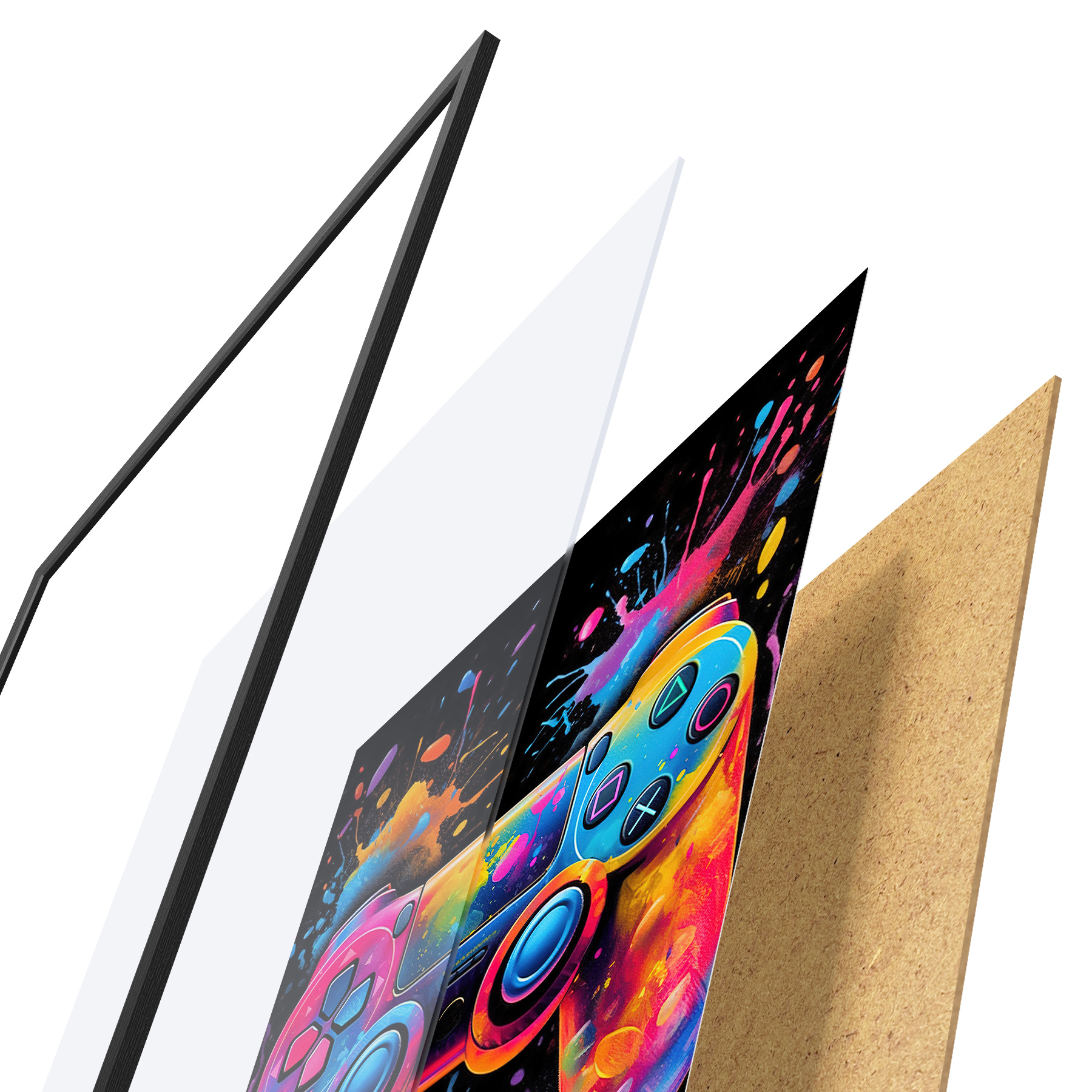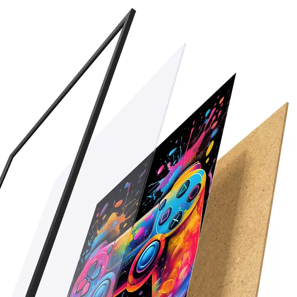 El póster consta de marco, plexiglás, imagen impresa y soporte de aglomerado. El póster puede colgarse inmediatamente en la pared gracias a los soportes de la parte posterior.