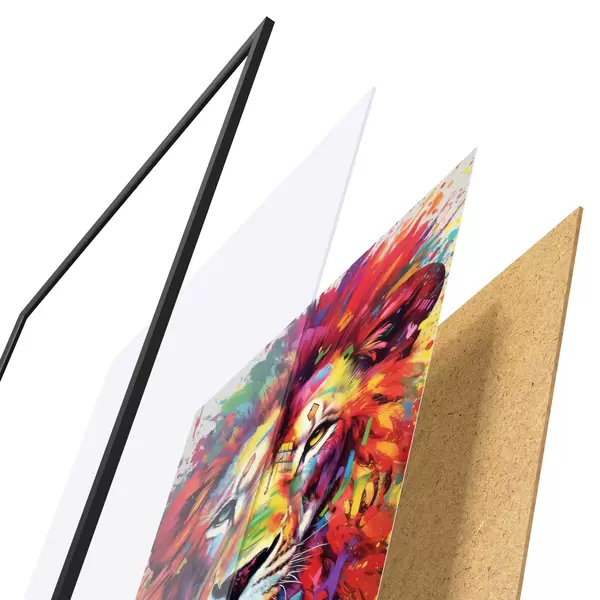 El póster consta de marco, plexiglás, imagen impresa y soporte de aglomerado. El póster puede colgarse inmediatamente en la pared gracias a los soportes de la parte posterior.