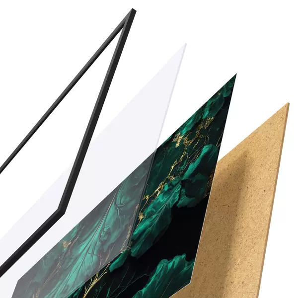El póster consta de marco, plexiglás, imagen impresa y soporte de aglomerado. El póster puede colgarse inmediatamente en la pared gracias a los soportes de la parte posterior.