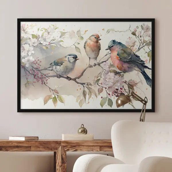 Poster Pájaros coloridos posados entre las flores. Nr f34490