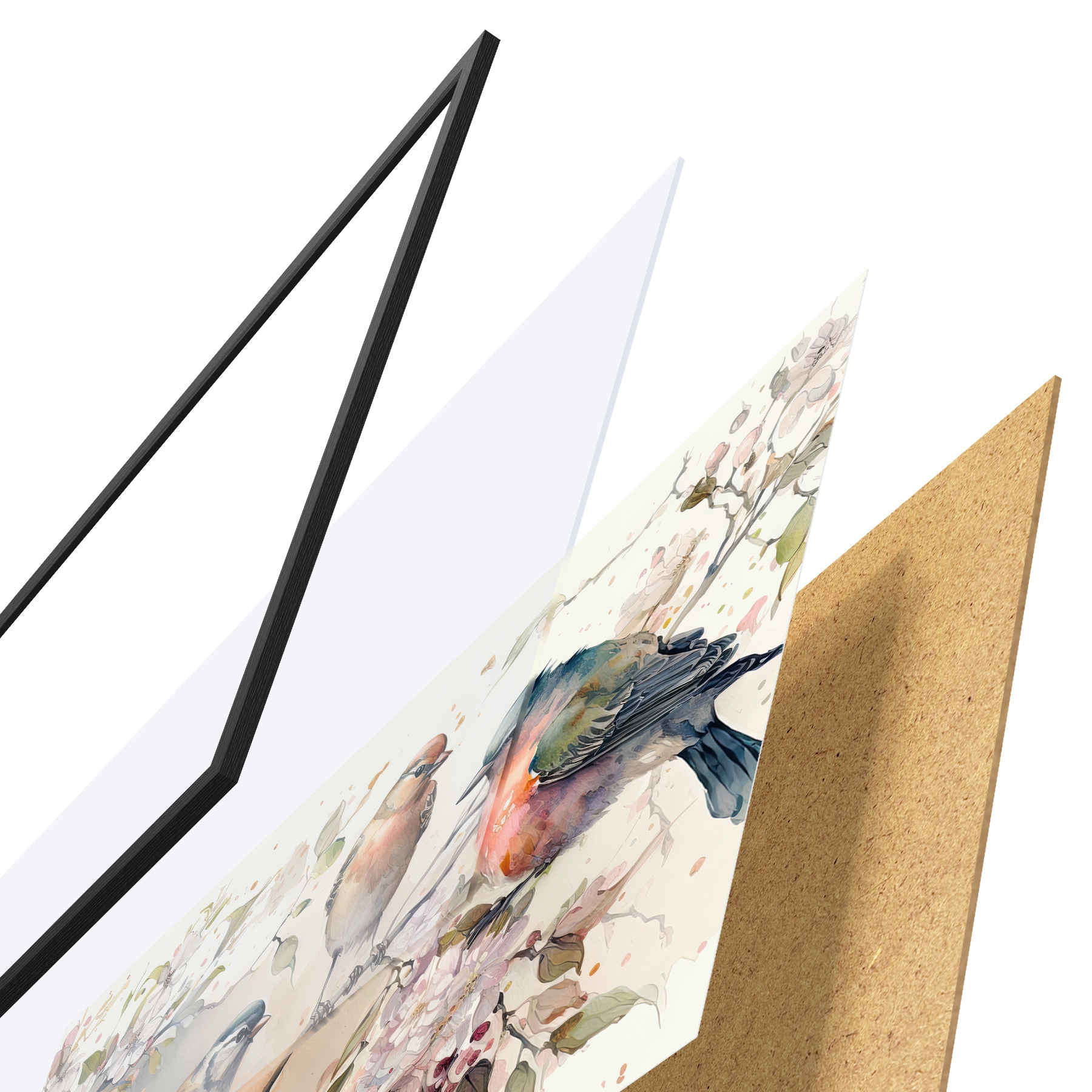 El póster consta de marco, plexiglás, imagen impresa y soporte de aglomerado. El póster puede colgarse inmediatamente en la pared gracias a los soportes de la parte posterior.