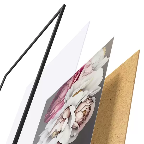 El póster consta de marco, plexiglás, imagen impresa y soporte de aglomerado. El póster puede colgarse inmediatamente en la pared gracias a los soportes de la parte posterior.
