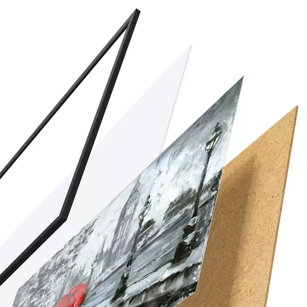 El póster consta de marco, plexiglás, imagen impresa y soporte de aglomerado. El póster puede colgarse inmediatamente en la pared gracias a los soportes de la parte posterior.