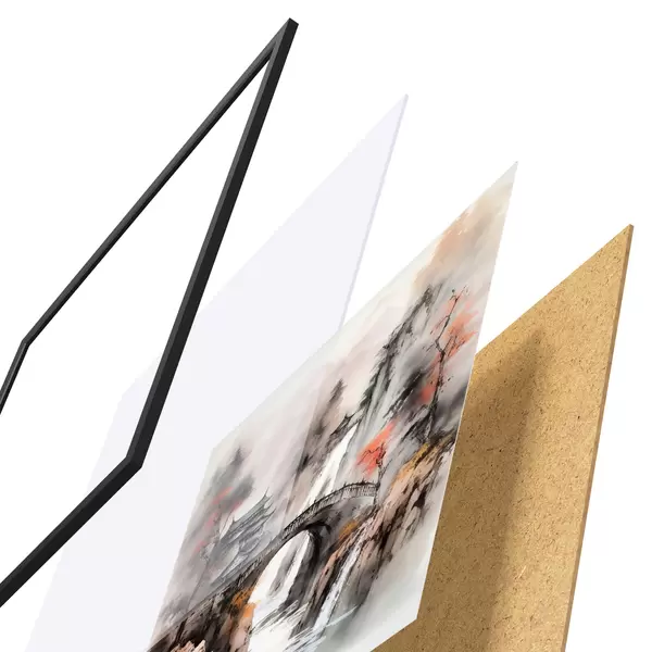 El póster consta de marco, plexiglás, imagen impresa y soporte de aglomerado. El póster puede colgarse inmediatamente en la pared gracias a los soportes de la parte posterior.