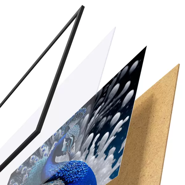 El póster consta de marco, plexiglás, imagen impresa y soporte de aglomerado. El póster puede colgarse inmediatamente en la pared gracias a los soportes de la parte posterior.