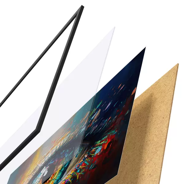 El póster consta de marco, plexiglás, imagen impresa y soporte de aglomerado. El póster puede colgarse inmediatamente en la pared gracias a los soportes de la parte posterior.