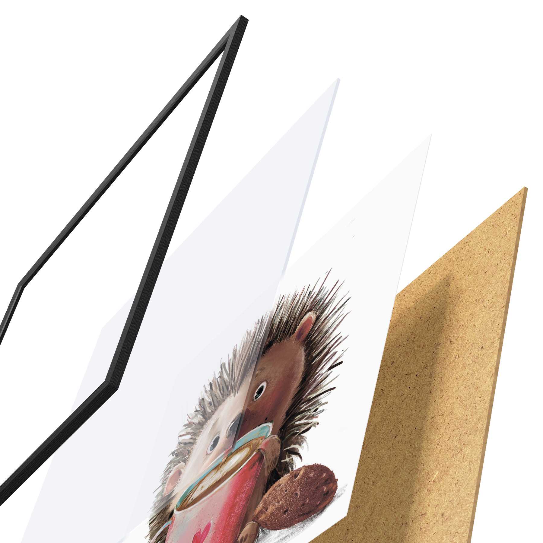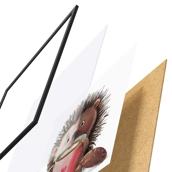 El póster consta de marco, plexiglás, imagen impresa y soporte de aglomerado. El póster puede colgarse inmediatamente en la pared gracias a los soportes de la parte posterior.