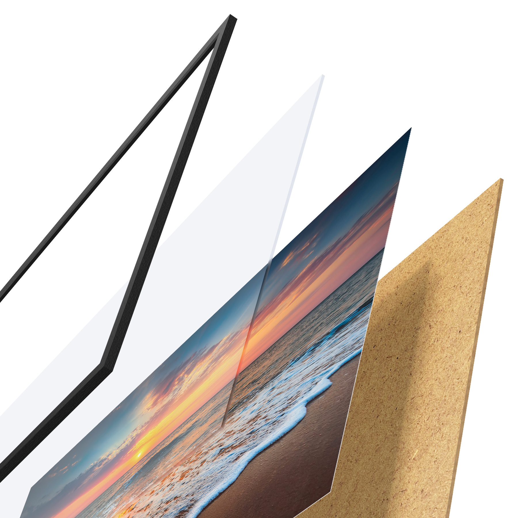 El póster consta de marco, plexiglás, imagen impresa y soporte de aglomerado. El póster puede colgarse inmediatamente en la pared gracias a los soportes de la parte posterior.