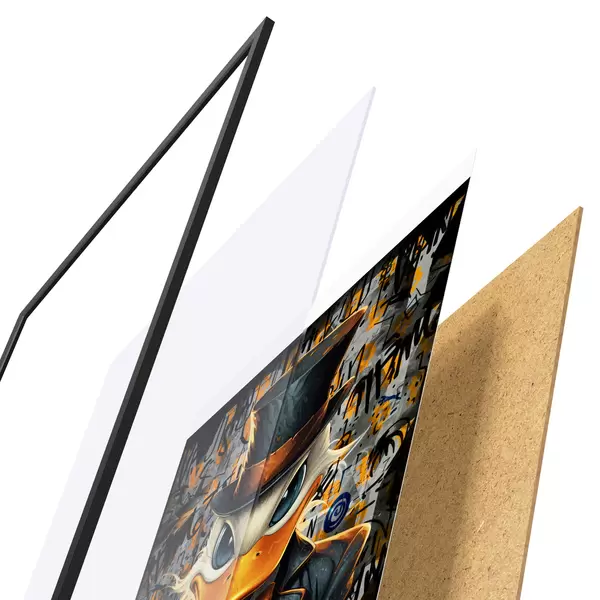 El póster consta de marco, plexiglás, imagen impresa y soporte de aglomerado. El póster puede colgarse inmediatamente en la pared gracias a los soportes de la parte posterior.