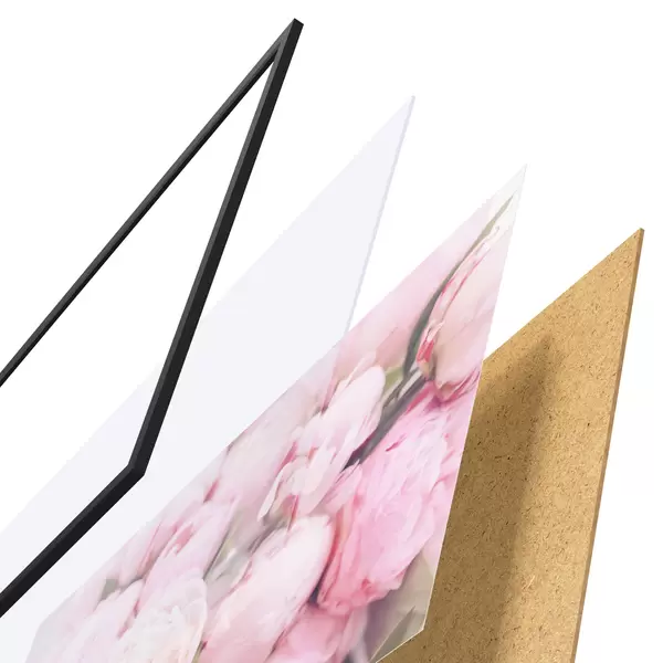 El póster consta de marco, plexiglás, imagen impresa y soporte de aglomerado. El póster puede colgarse inmediatamente en la pared gracias a los soportes de la parte posterior.