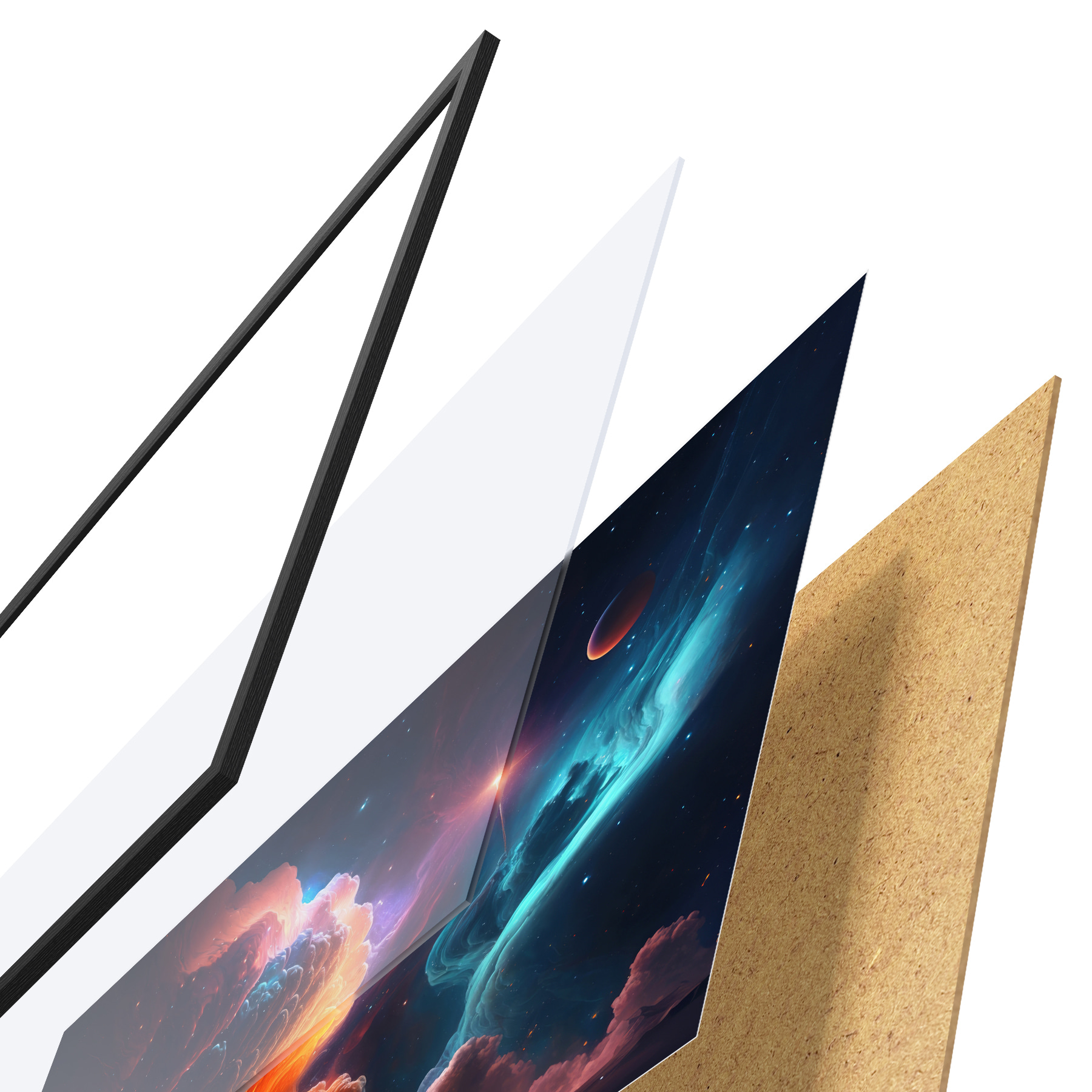 El póster consta de marco, plexiglás, imagen impresa y soporte de aglomerado. El póster puede colgarse inmediatamente en la pared gracias a los soportes de la parte posterior.