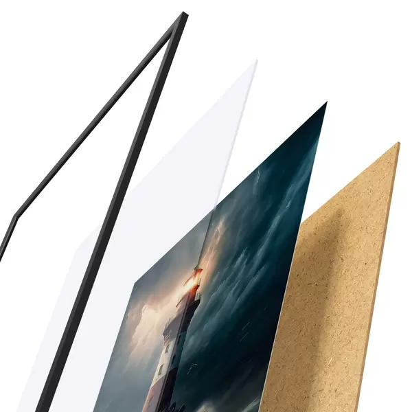 El póster consta de marco, plexiglás, imagen impresa y soporte de aglomerado. El póster puede colgarse inmediatamente en la pared gracias a los soportes de la parte posterior.