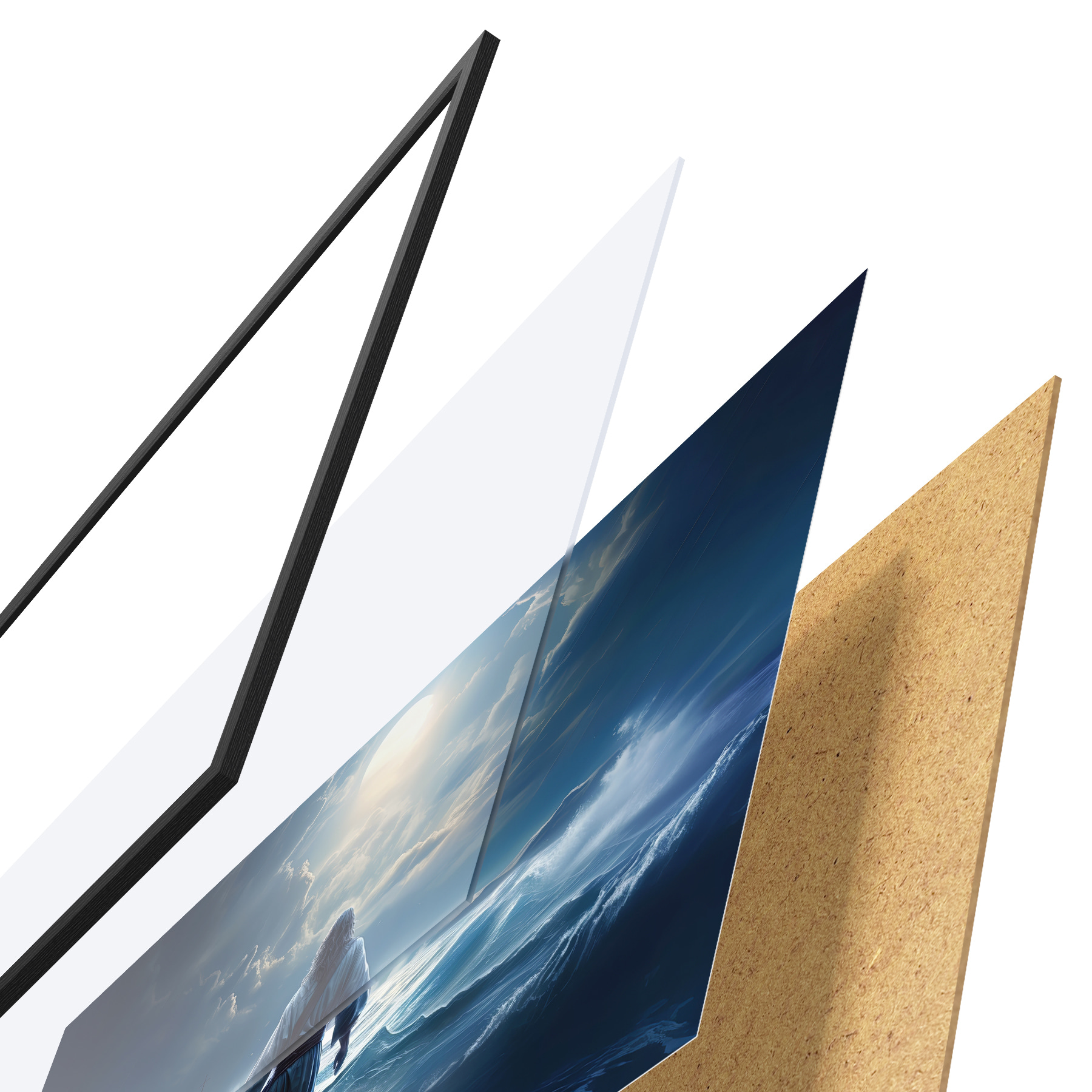 El póster consta de marco, plexiglás, imagen impresa y soporte de aglomerado. El póster puede colgarse inmediatamente en la pared gracias a los soportes de la parte posterior.
