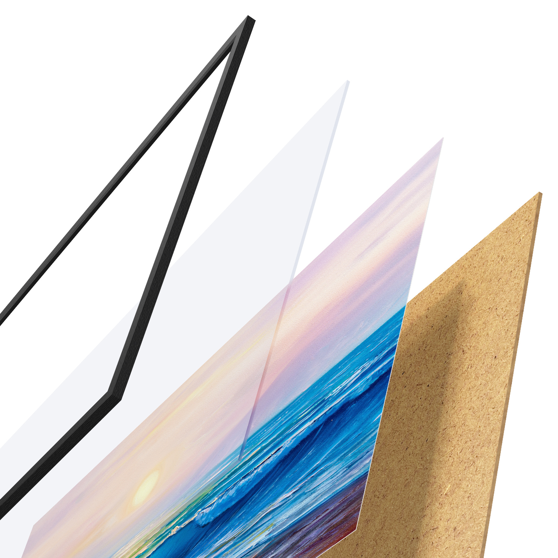 El póster consta de marco, plexiglás, imagen impresa y soporte de aglomerado. El póster puede colgarse inmediatamente en la pared gracias a los soportes de la parte posterior.