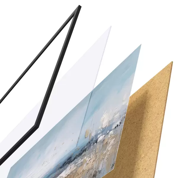 El póster consta de marco, plexiglás, imagen impresa y soporte de aglomerado. El póster puede colgarse inmediatamente en la pared gracias a los soportes de la parte posterior.