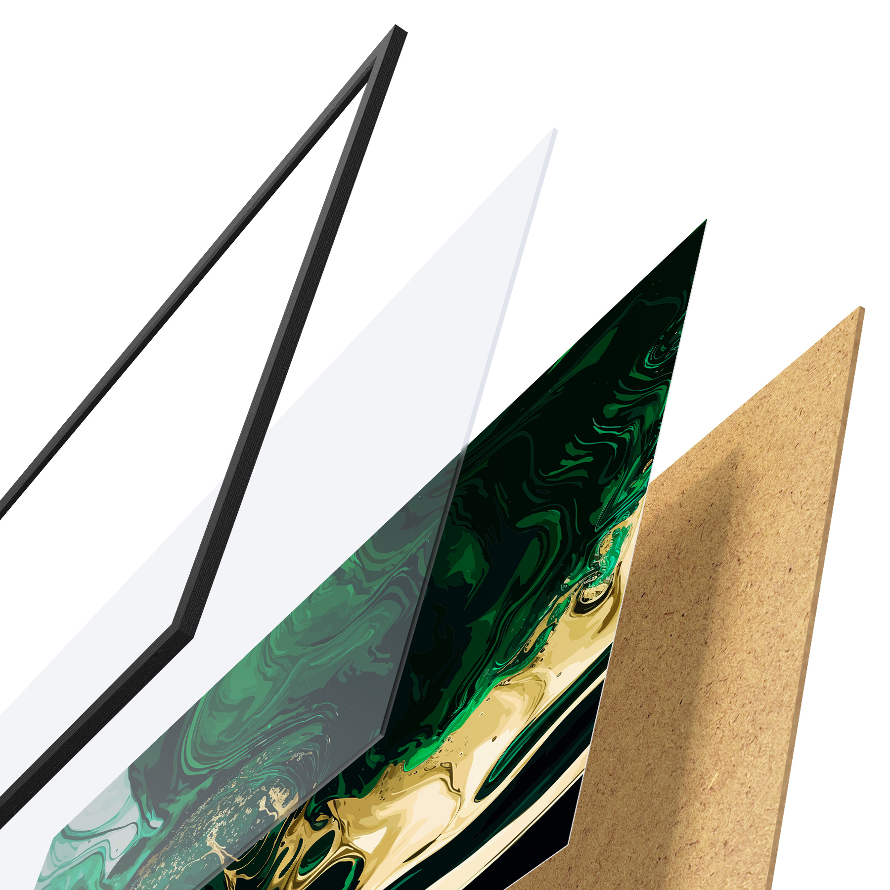 El póster consta de marco, plexiglás, imagen impresa y soporte de aglomerado. El póster puede colgarse inmediatamente en la pared gracias a los soportes de la parte posterior.