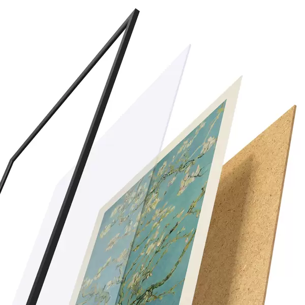 El póster consta de marco, plexiglás, imagen impresa y soporte de aglomerado. El póster puede colgarse inmediatamente en la pared gracias a los soportes de la parte posterior.
