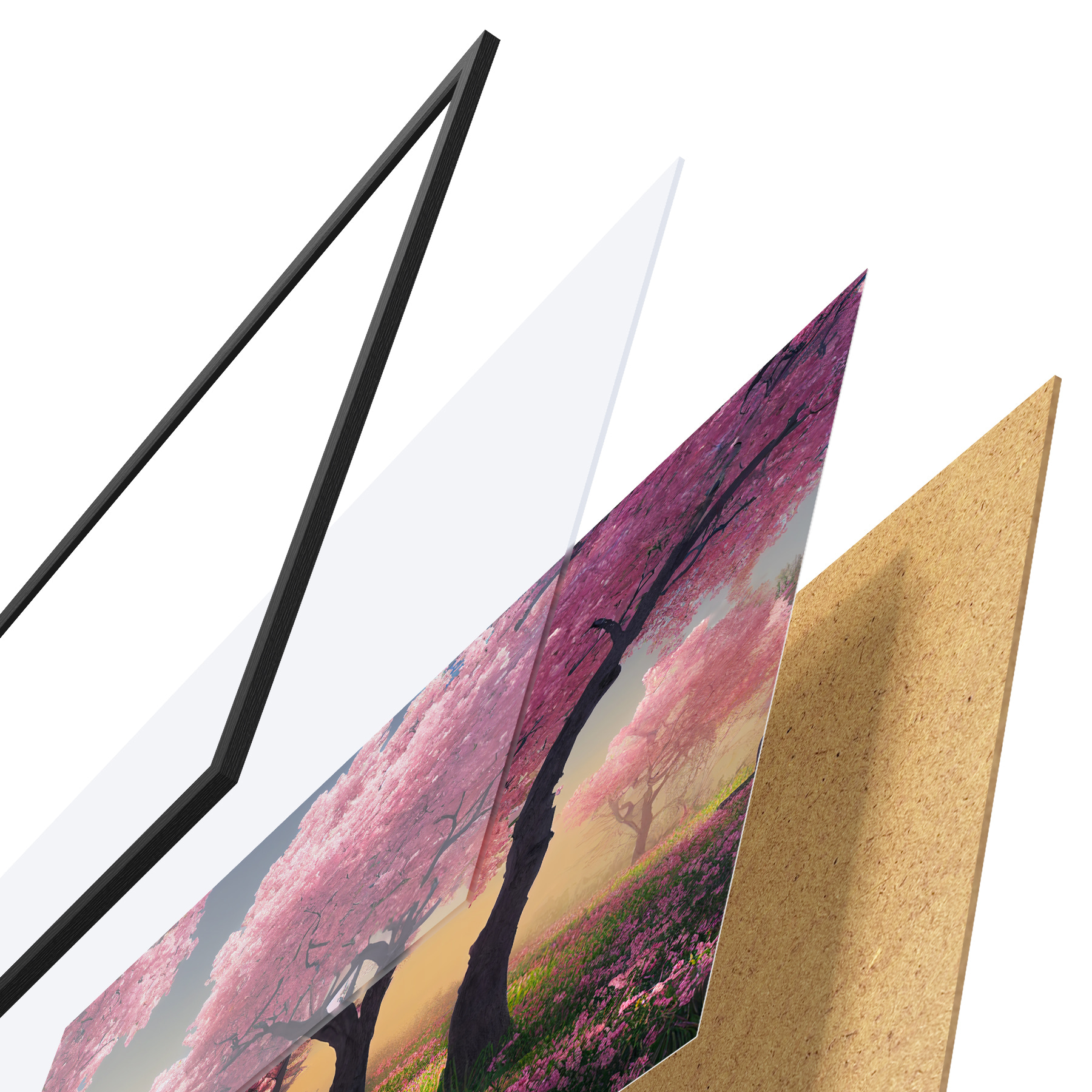 El póster consta de marco, plexiglás, imagen impresa y soporte de aglomerado. El póster puede colgarse inmediatamente en la pared gracias a los soportes de la parte posterior.
