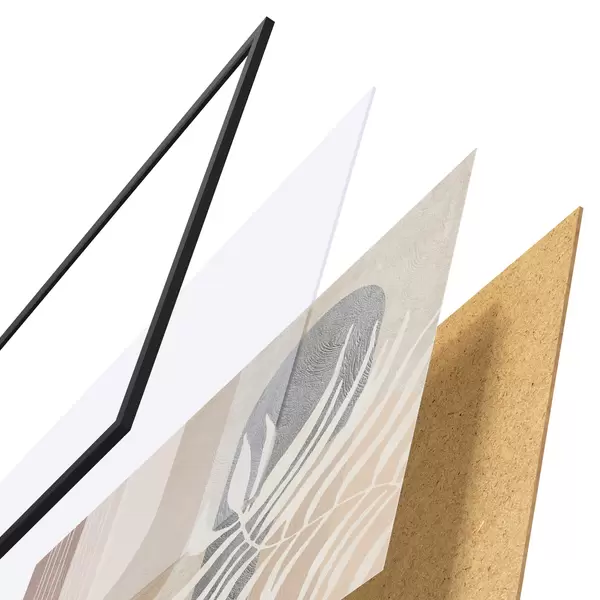 El póster consta de marco, plexiglás, imagen impresa y soporte de aglomerado. El póster puede colgarse inmediatamente en la pared gracias a los soportes de la parte posterior.