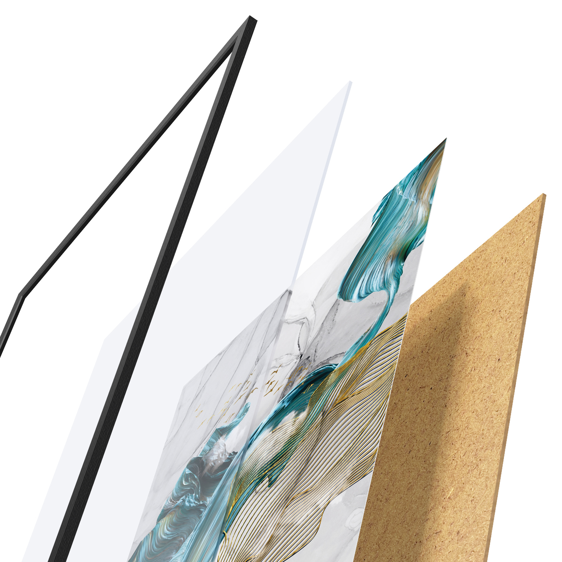 El póster consta de marco, plexiglás, imagen impresa y soporte de aglomerado. El póster puede colgarse inmediatamente en la pared gracias a los soportes de la parte posterior.