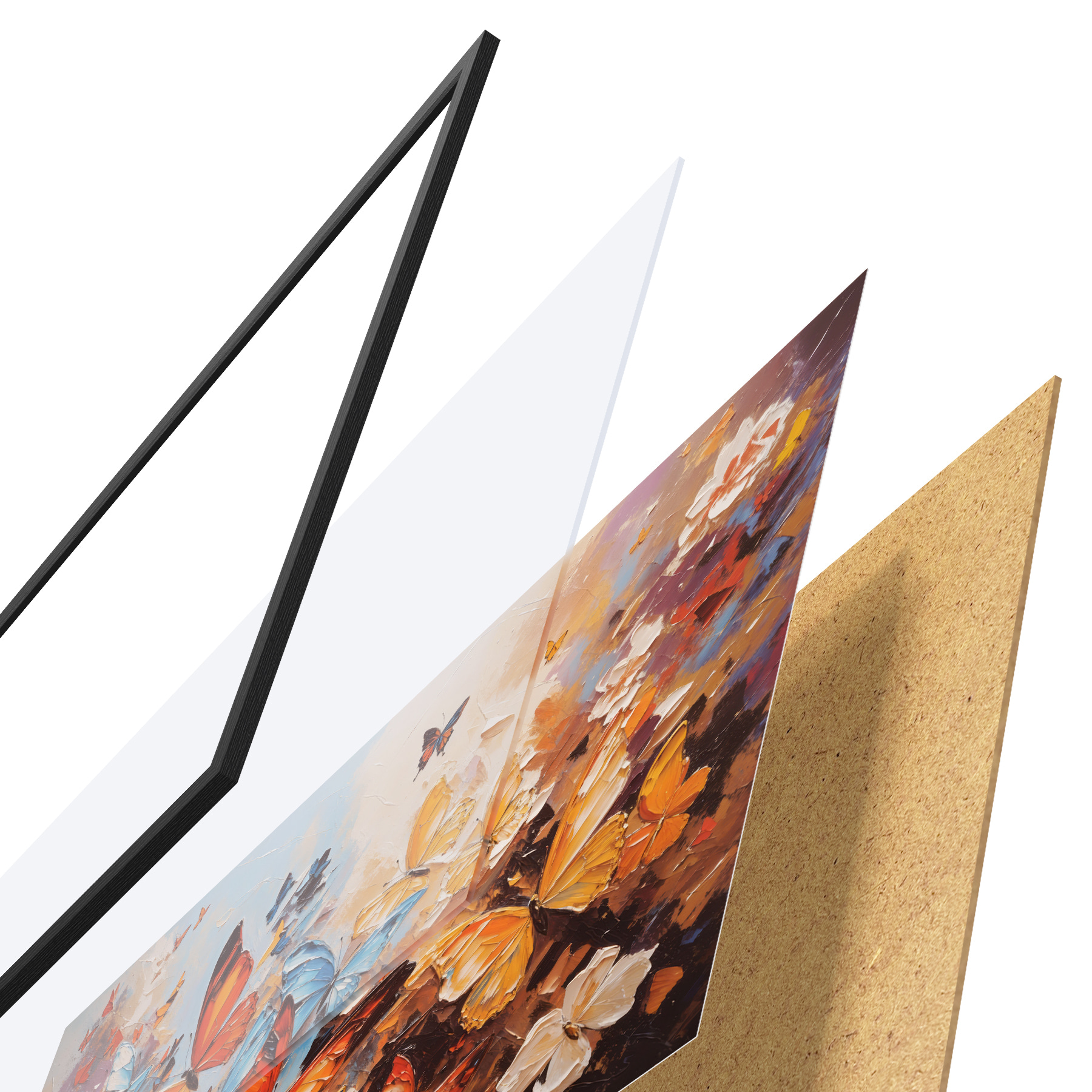 El póster consta de marco, plexiglás, imagen impresa y soporte de aglomerado. El póster puede colgarse inmediatamente en la pared gracias a los soportes de la parte posterior.