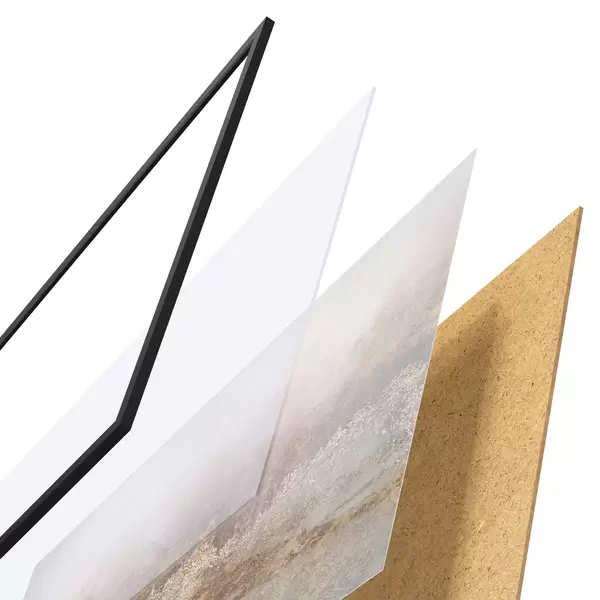 El póster consta de marco, plexiglás, imagen impresa y soporte de aglomerado. El póster puede colgarse inmediatamente en la pared gracias a los soportes de la parte posterior.